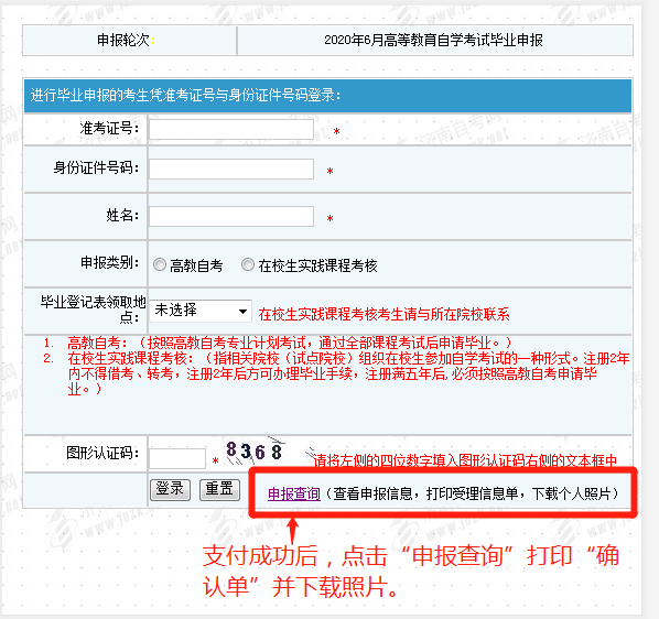 1.考生登录济南市教育招生考试院网站(www.jnzk.net),选择正确的考生类型进行网上毕业申报,系统自动预审通过后进行网上交费,并打印《毕业生网上申报信息核对确认单》、下载本人照片。