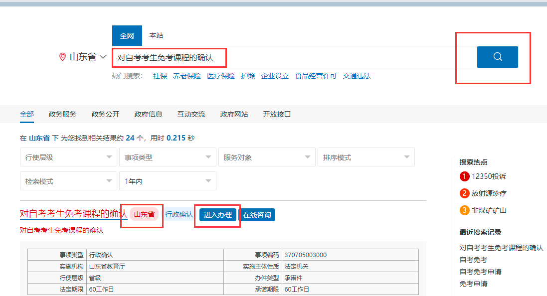 2.在网站首页中间的输入框中输入“对自考考生免考课程的确认”,点击“一网通办”后出现如下页面,确认“山东省”的事项,点击“进入办理”。