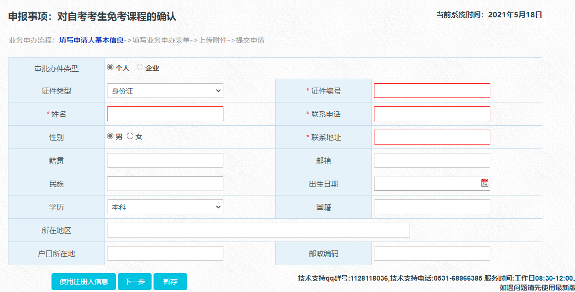 5.考生在“个人登录”界面,成功登录后,进入下图所示页面,根据提示填写申请人基本信息、业务申请表单、上传材料附件,最后提交申请即可。