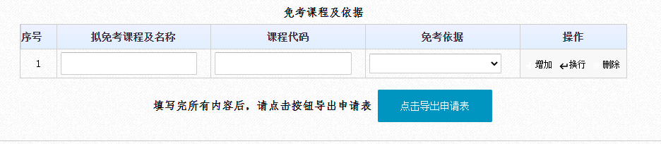 (4)下方表格“免考课程及依据”需要填写自考课程的全名称,带有括号的课程名称使用中文括号“(”和“)”,免考依据为下拉框选择;