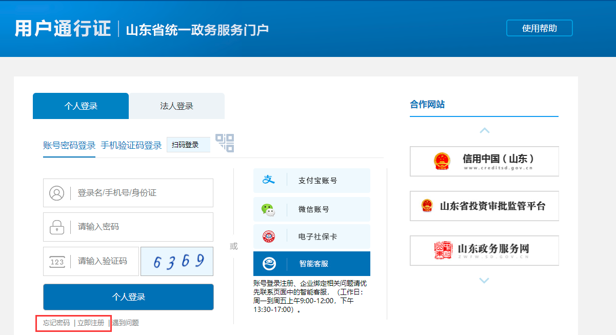 3.点击“进入办理”后,进入下图所示的“个人登录”页面。登录前需要先完成个人注册,点击左下角的“立即注册”,会进入“账号注册”页面,如已有帐号无需重复注册。