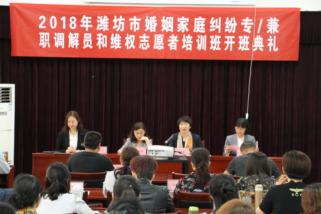 山东省妇联权益部副部长郝亚冰对本次培训班开班表示祝贺,对潍坊市妇联近几年的工作给予了肯定。潍坊市妇联副主席张启云对学校继续教育学院为培训班所提供的各项服务工作表示感谢,并强调举办此次培训班是认真贯彻落实山东省全面展开新旧动能转换重大工程和市委“四个城市”建设战略部署的重要举措。并对参训学员提出了三点意见:一要充分认识做好婚姻家庭纠纷调解和妇女维权工作的重要意义;二要端正学习态度,珍惜培训机会;三要严格遵守纪律,维护良好形象。
