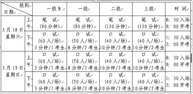考试时间为2017年3月18日至19日。开考级别为一级B、一级、二级、三级。各级别具体考试时间安排如下: